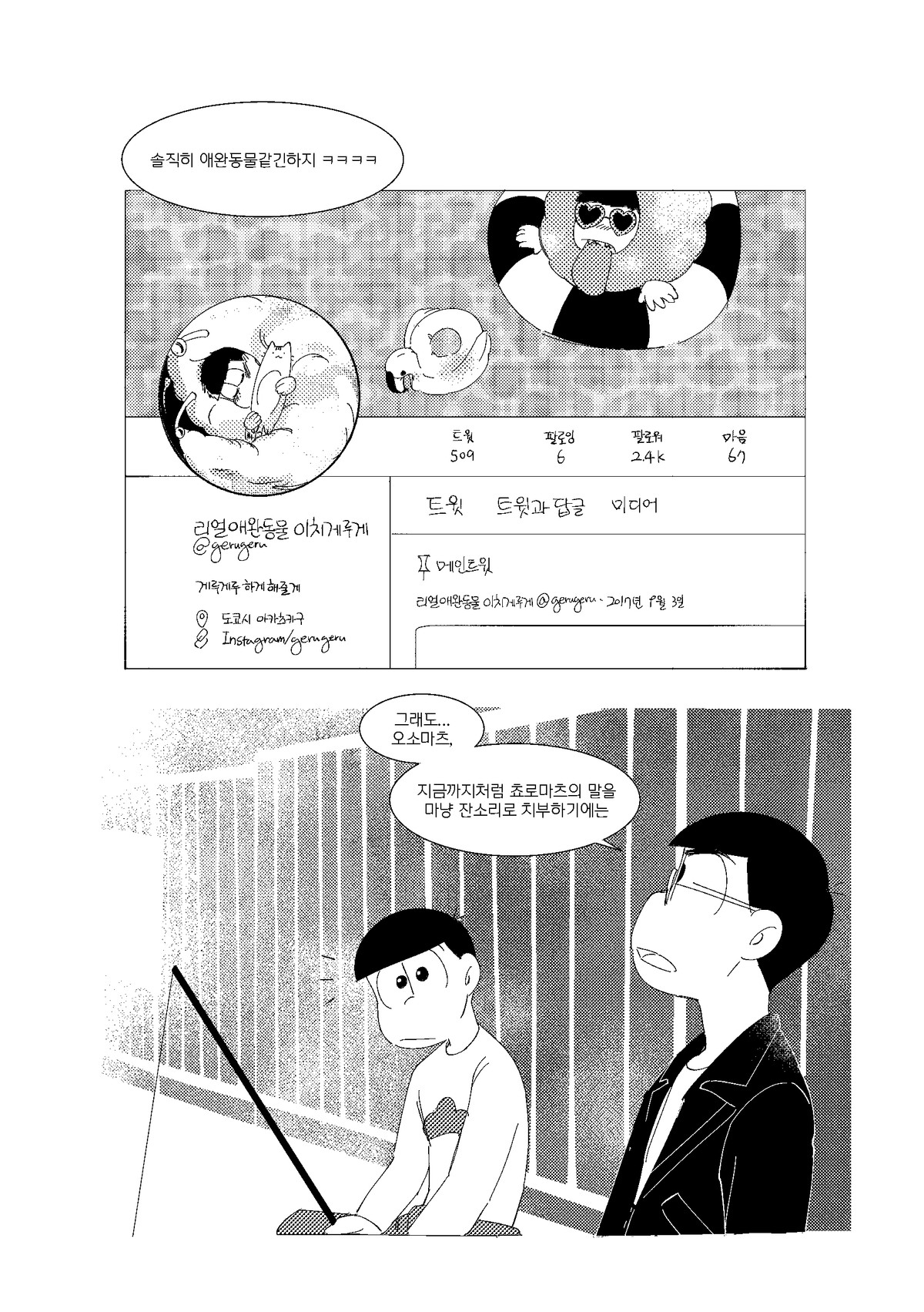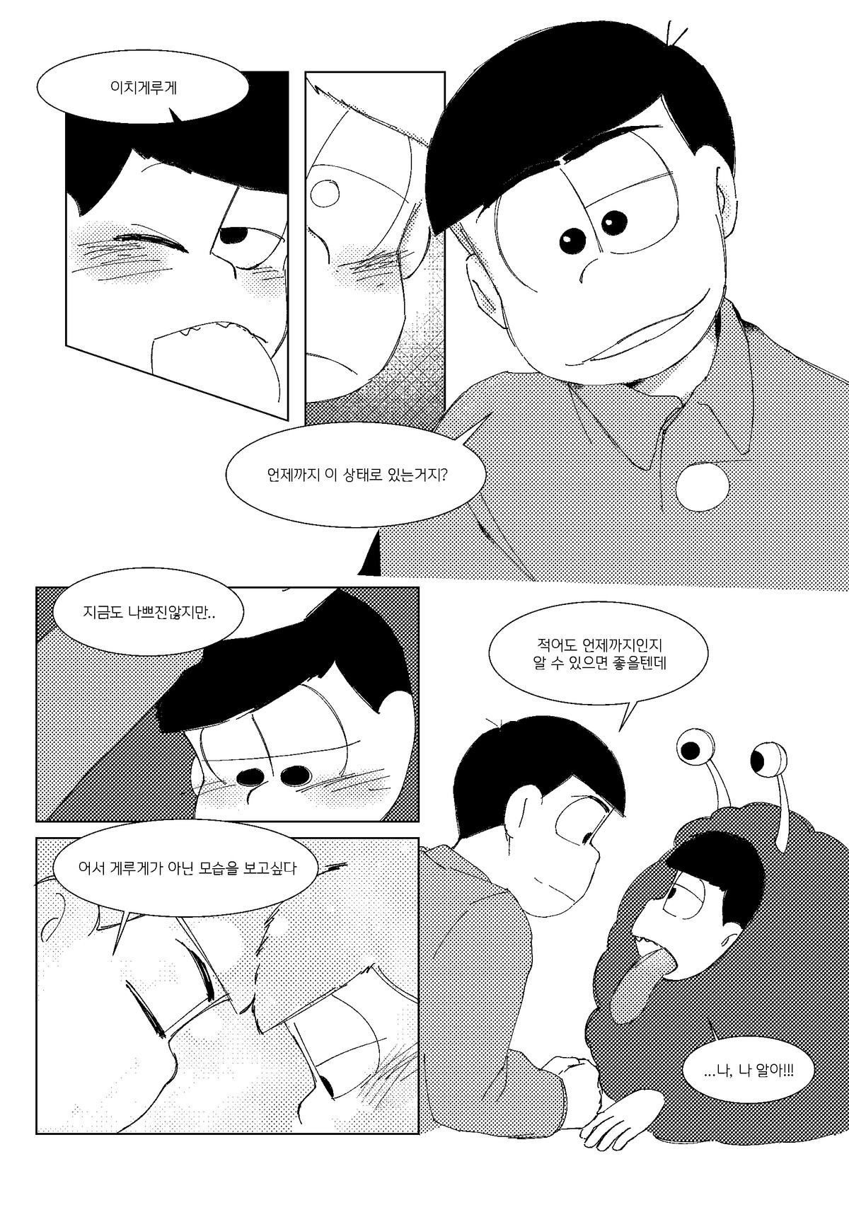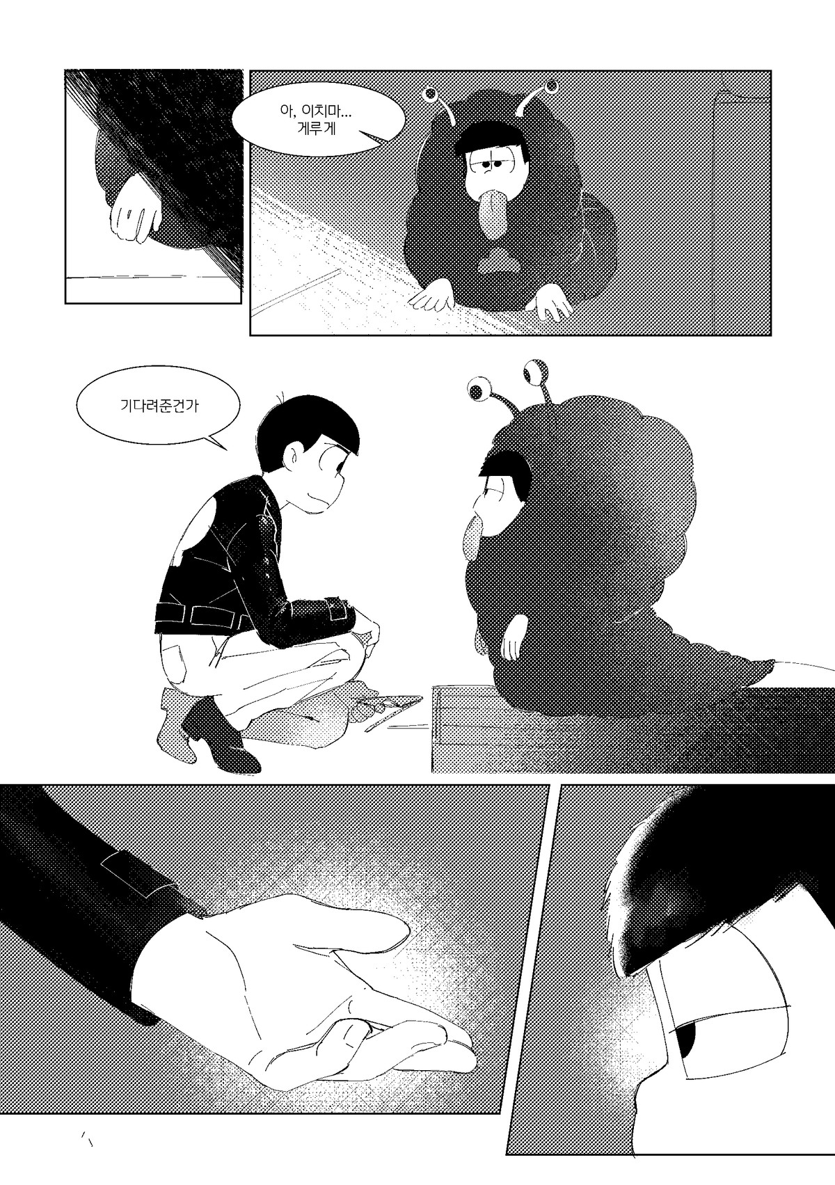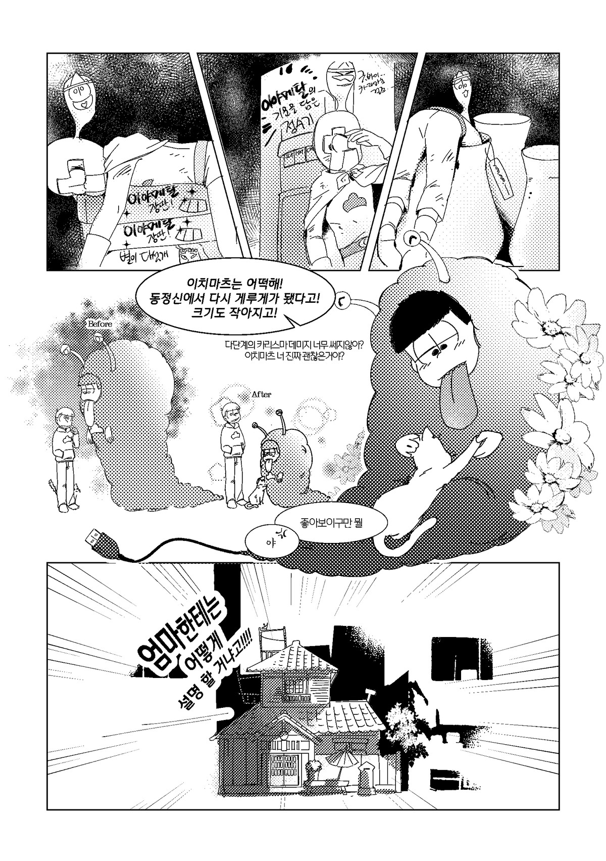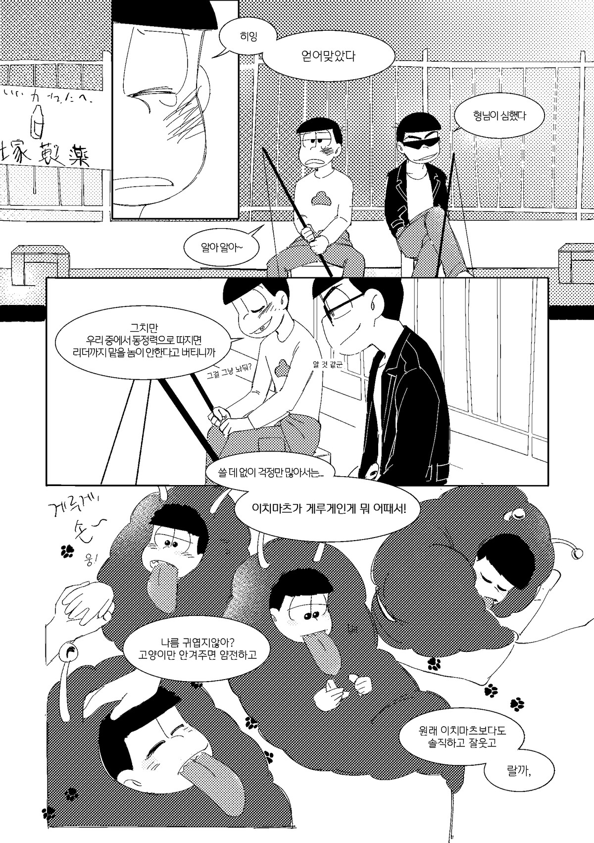 🍏171013*22:26 저러고 집으로 돌아올때는 내의만 입고오는것이다 서생쵸로는 왠지 남의집에서 더부살이 할거라는 이미지가 있는데 주인할아버지든 할머니든간에 귀가한 쵸로마츠보고 옷은 어디다두고왔냐고 놀라서 물으면 좋겠다 ㅋㅋㅋ 게다도 잃어버려서 맨발로 버선발 다 더러워져있고... 평소에 들고다니던 책도 너덜너덜해져있고 평소에 비해 엉망진창이라 아침새벽부터 나가서 뭔일당한건가싶어서 걱정하는데 쵸로마츠가 암것도아니라고 괜찮다고그러면서 비척대면서 방에 들어가는거 보고싶네ㅋㅋㅋㅋ 공부하는 책상위에 엎드려서 몰래 주워온 비늘 촛불불빛에 이리저리 비쳐보면 좋겠다 혼자서 괜찮으려나... 안들켰으려나.. 이생각하면서..(눈물줄줄 근데 한 이틀째되어도 인어를 잡았다는 말이 없어서 혹시나싶어서 그때 숨겨뒀던 장소 다시 찾아갔는데 그 자리 그대로 쵸로마츠가 입혀준 겉옷 꼭쥐고 웅크려서 잠들어있는 인어이치마츠라던가 보고싶다 쵸로마츠가 옷 잘 여며주면서 어디 나오지말고 잘 숨어있으라고 말하고가서... 말잘듣는 물고기인것ww