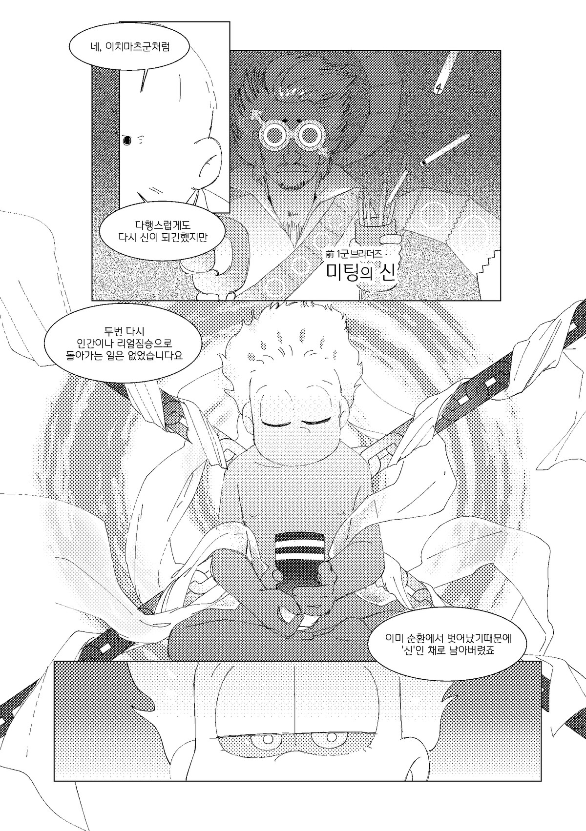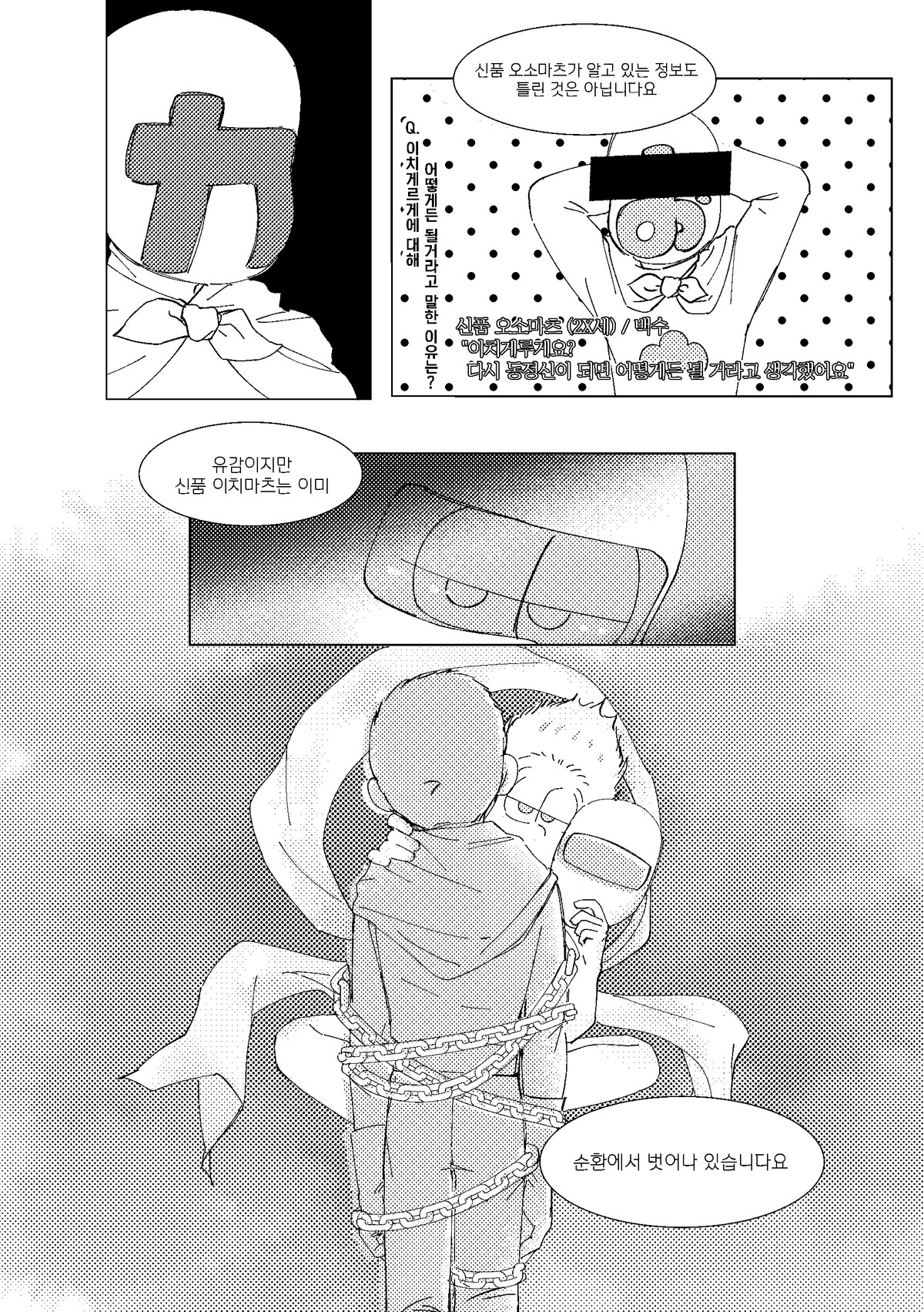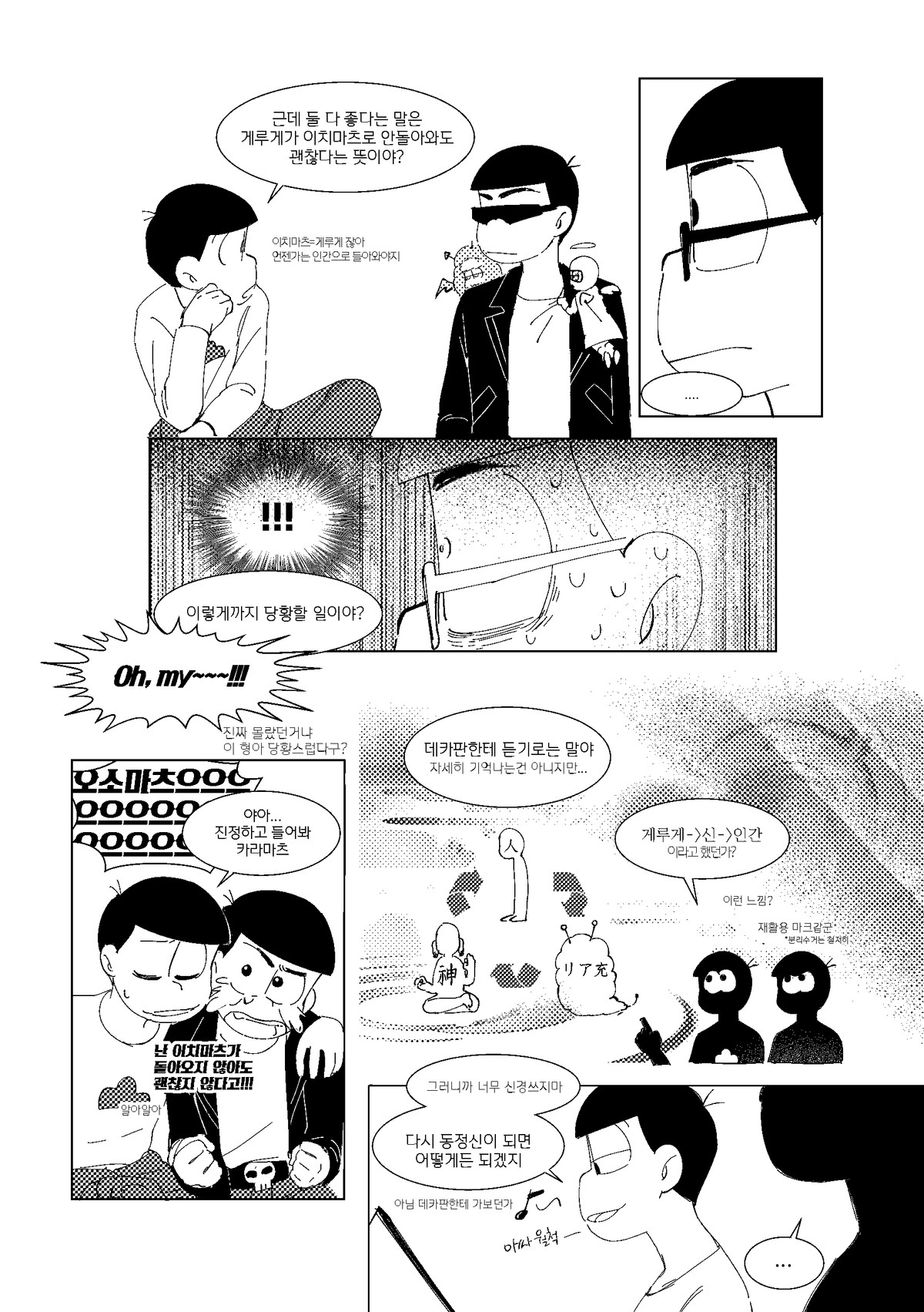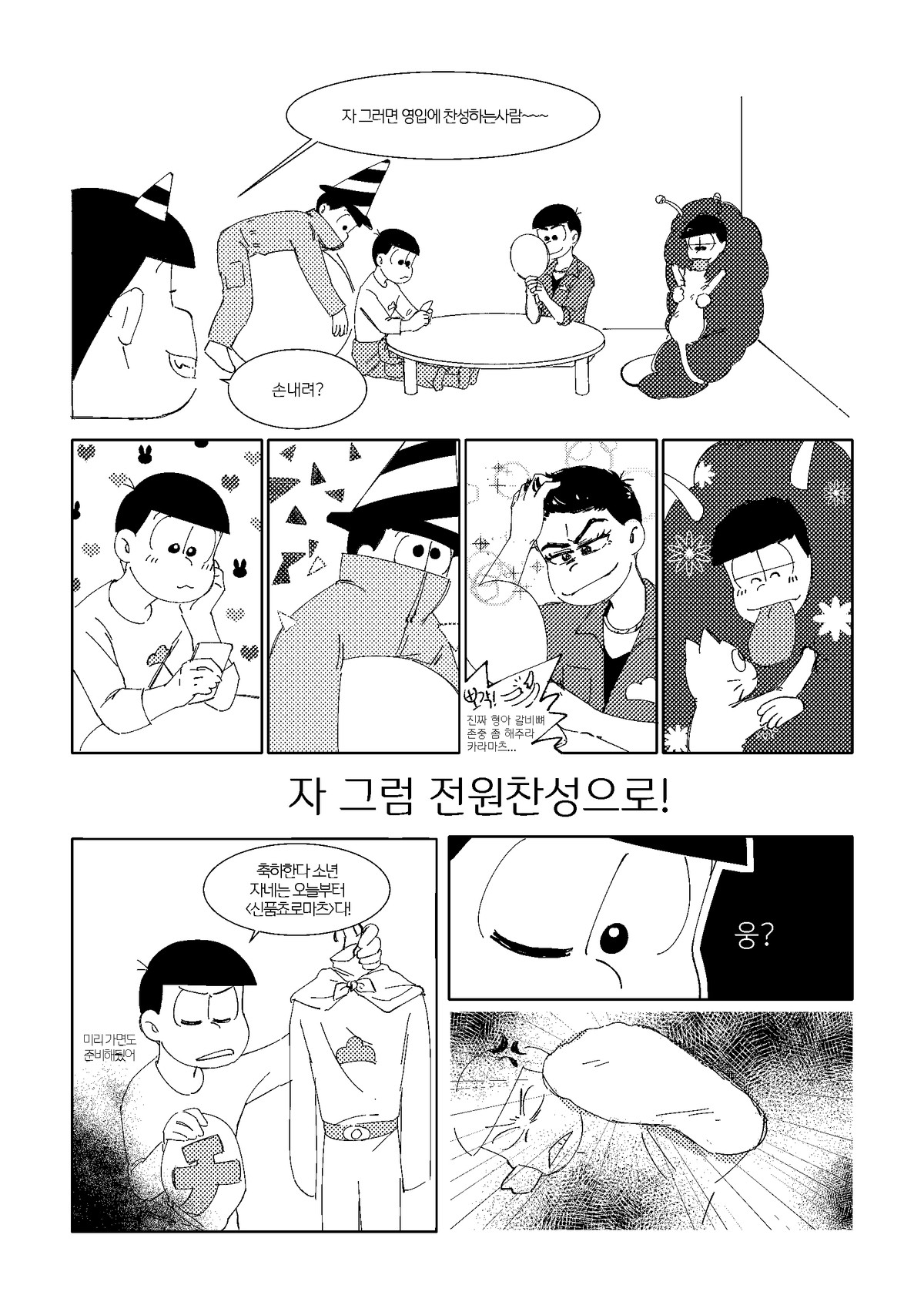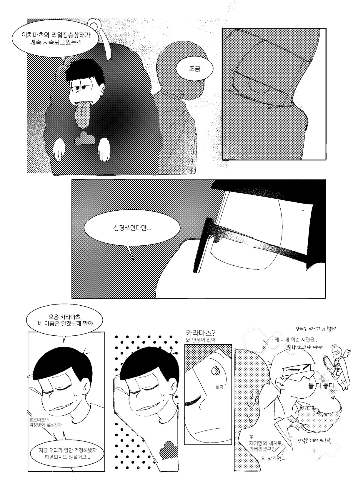 🍏171013*22:26 저러고 집으로 돌아올때는 내의만 입고오는것이다 서생쵸로는 왠지 남의집에서 더부살이 할거라는 이미지가 있는데 주인할아버지든 할머니든간에 귀가한 쵸로마츠보고 옷은 어디다두고왔냐고 놀라서 물으면 좋겠다 ㅋㅋㅋ 게다도 잃어버려서 맨발로 버선발 다 더러워져있고... 평소에 들고다니던 책도 너덜너덜해져있고 평소에 비해 엉망진창이라 아침새벽부터 나가서 뭔일당한건가싶어서 걱정하는데 쵸로마츠가 암것도아니라고 괜찮다고그러면서 비척대면서 방에 들어가는거 보고싶네ㅋㅋㅋㅋ 공부하는 책상위에 엎드려서 몰래 주워온 비늘 촛불불빛에 이리저리 비쳐보면 좋겠다 혼자서 괜찮으려나... 안들켰으려나.. 이생각하면서..(눈물줄줄 근데 한 이틀째되어도 인어를 잡았다는 말이 없어서 혹시나싶어서 그때 숨겨뒀던 장소 다시 찾아갔는데 그 자리 그대로 쵸로마츠가 입혀준 겉옷 꼭쥐고 웅크려서 잠들어있는 인어이치마츠라던가 보고싶다 쵸로마츠가 옷 잘 여며주면서 어디 나오지말고 잘 숨어있으라고 말하고가서... 말잘듣는 물고기인것ww