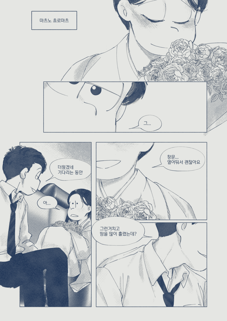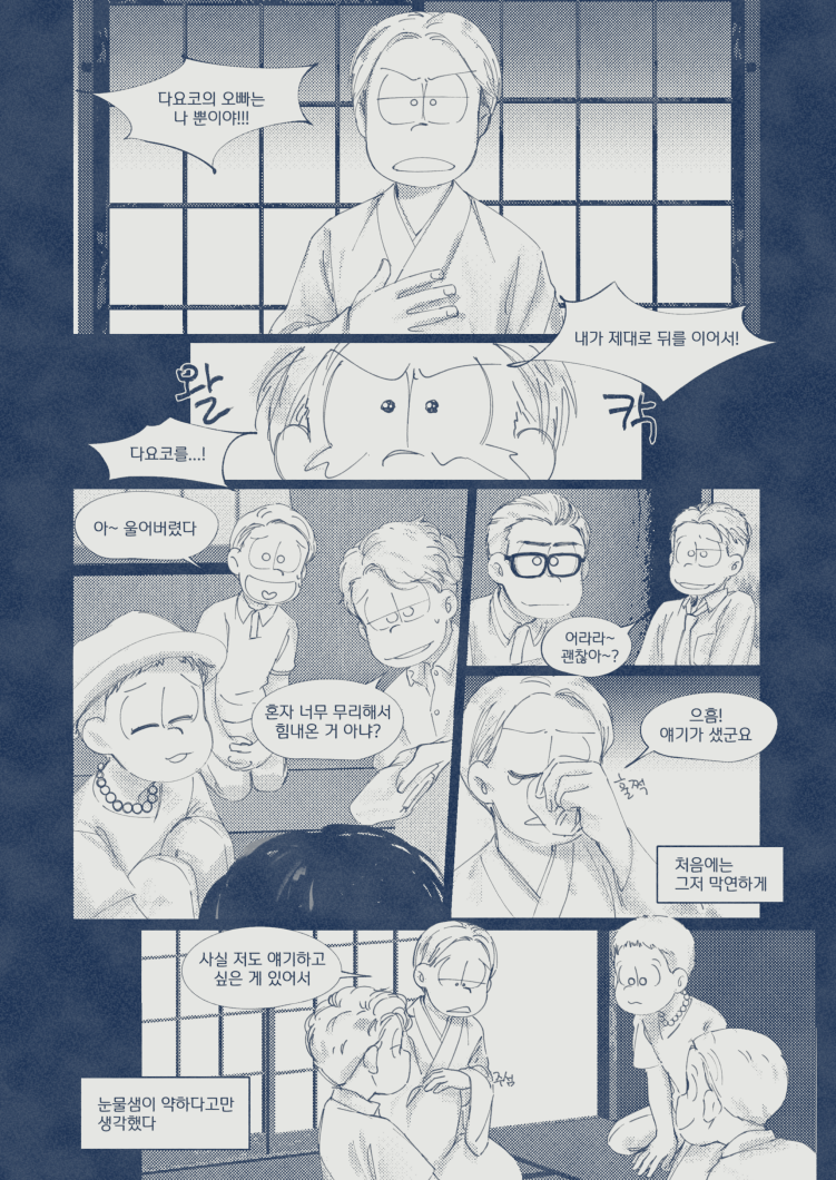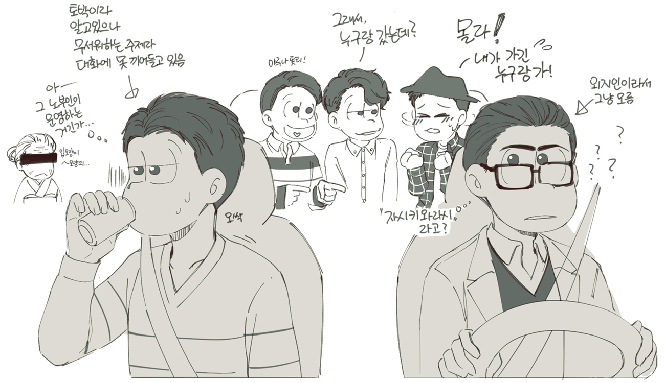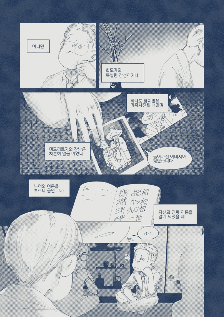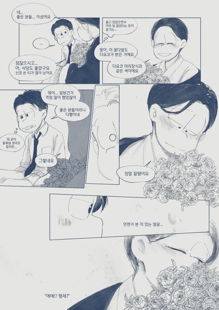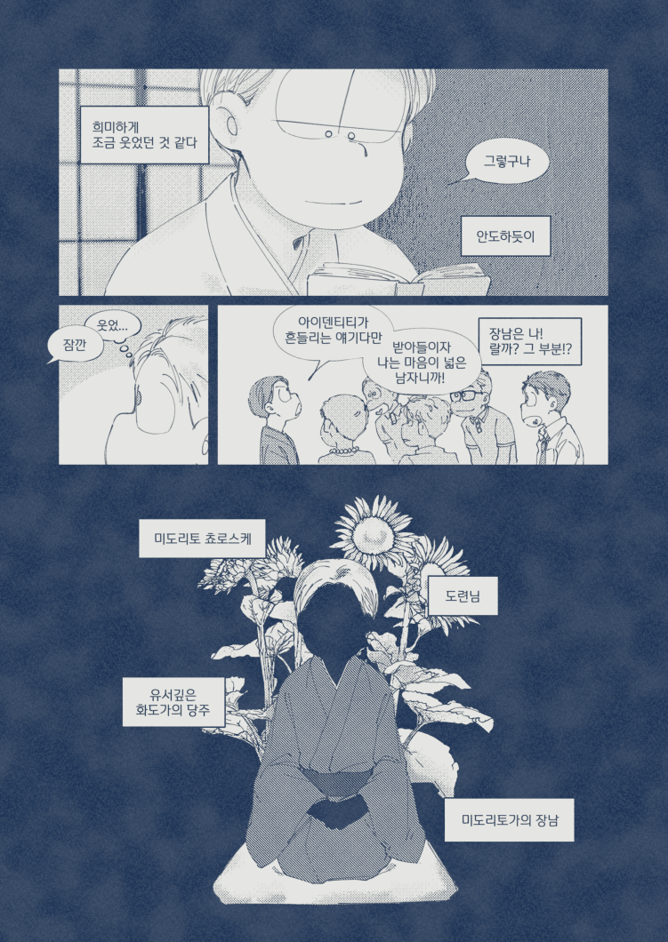 🍏180826*13:58 저 장면 그리느라 저 형제들전부가 처음으로 조우하게되는부분 엄청 많이 읽었는데... 전기마츠 처음 봤을때부터도 생각했던거지만 쵸로스케 처음에 형제들앞에서 울었던거 너무 많은거 느껴짐 존나 내멋대로 생각하는거긴한데 아버지 죽고 하루아침에 가장이 된 부담감이라던가 여동생에 대한 책임감, 그리고 그동안 애비랑 다요코 얼굴보면서 누가봐도 안닮은거 알고 자기도 알아서 안그런척 하고있긴했지만 분명 그동안 유리된 기분 느끼고있었을거라고 궁예함.. 그래서 난데없이 형제라며 나타난 같은 얼굴 여섯을 앞에두고 자기가 어디서왔는지 이제야 알거같아서 아무말하면서 왈칵하고 운거 아닐까ㅋㅋㅋㅋ 근데 형제들도 그 기분 알거같아서 만난지도 얼마 안되고 어떻게보면 첫만남이고 그런사이에 쵸로스케가 조따 뜬금없는 타이밍에 울었는데도 막 ????? 던가 쟤 왜우냐갑자기; 이런 반응이 아니고 아~ 울어버렸다; 라던가 혼자서 너무 무리해온거아냐? 했던 거 아닌가 싶다