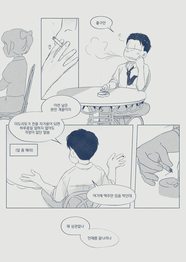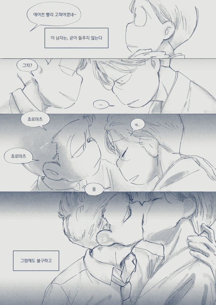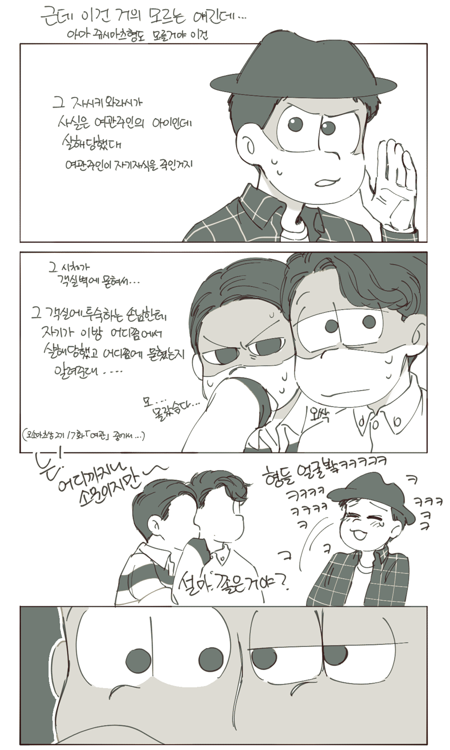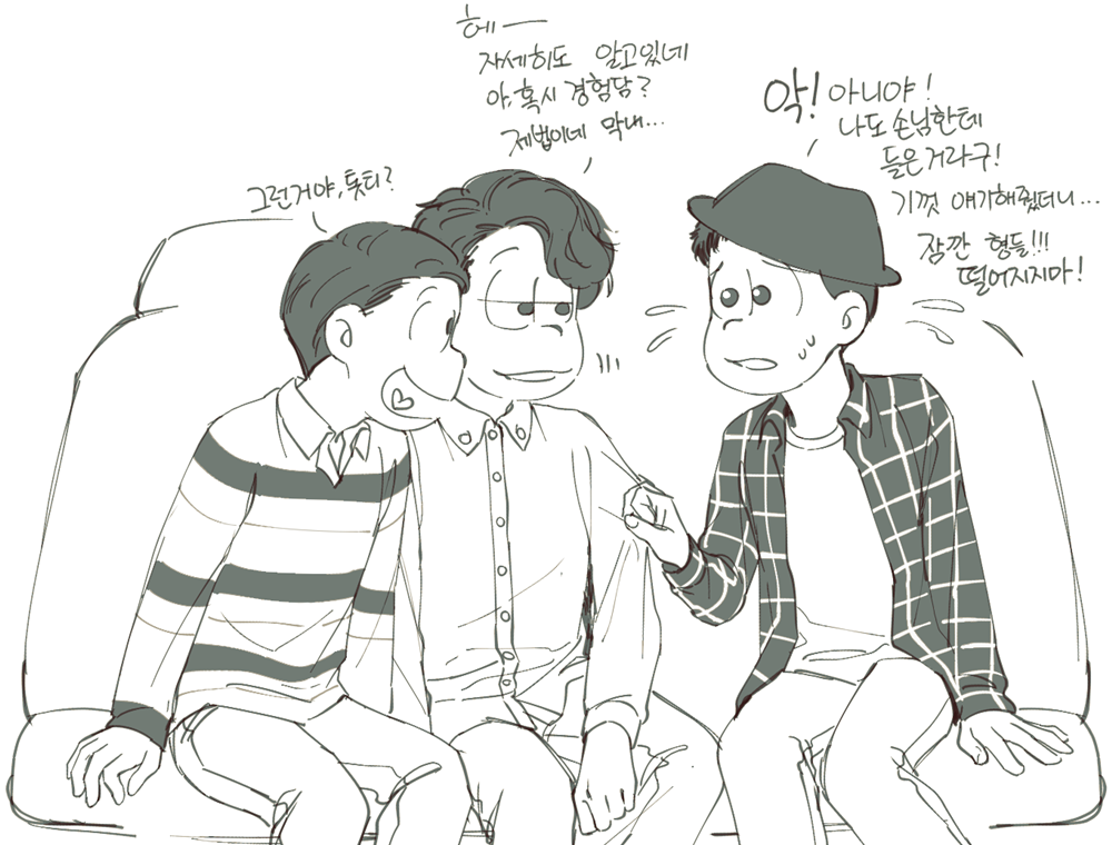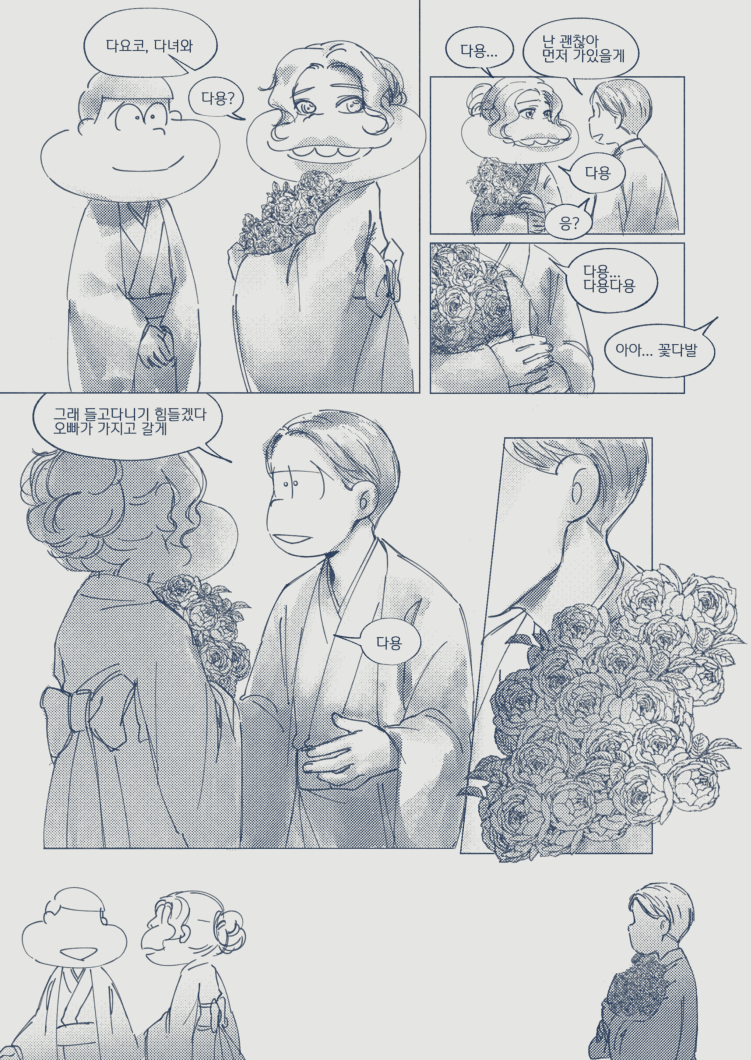 🍏180826*13:58 저 장면 그리느라 저 형제들전부가 처음으로 조우하게되는부분 엄청 많이 읽었는데... 전기마츠 처음 봤을때부터도 생각했던거지만 쵸로스케 처음에 형제들앞에서 울었던거 너무 많은거 느껴짐 존나 내멋대로 생각하는거긴한데 아버지 죽고 하루아침에 가장이 된 부담감이라던가 여동생에 대한 책임감, 그리고 그동안 애비랑 다요코 얼굴보면서 누가봐도 안닮은거 알고 자기도 알아서 안그런척 하고있긴했지만 분명 그동안 유리된 기분 느끼고있었을거라고 궁예함.. 그래서 난데없이 형제라며 나타난 같은 얼굴 여섯을 앞에두고 자기가 어디서왔는지 이제야 알거같아서 아무말하면서 왈칵하고 운거 아닐까ㅋㅋㅋㅋ 근데 형제들도 그 기분 알거같아서 만난지도 얼마 안되고 어떻게보면 첫만남이고 그런사이에 쵸로스케가 조따 뜬금없는 타이밍에 울었는데도 막 ????? 던가 쟤 왜우냐갑자기; 이런 반응이 아니고 아~ 울어버렸다; 라던가 혼자서 너무 무리해온거아냐? 했던 거 아닌가 싶다