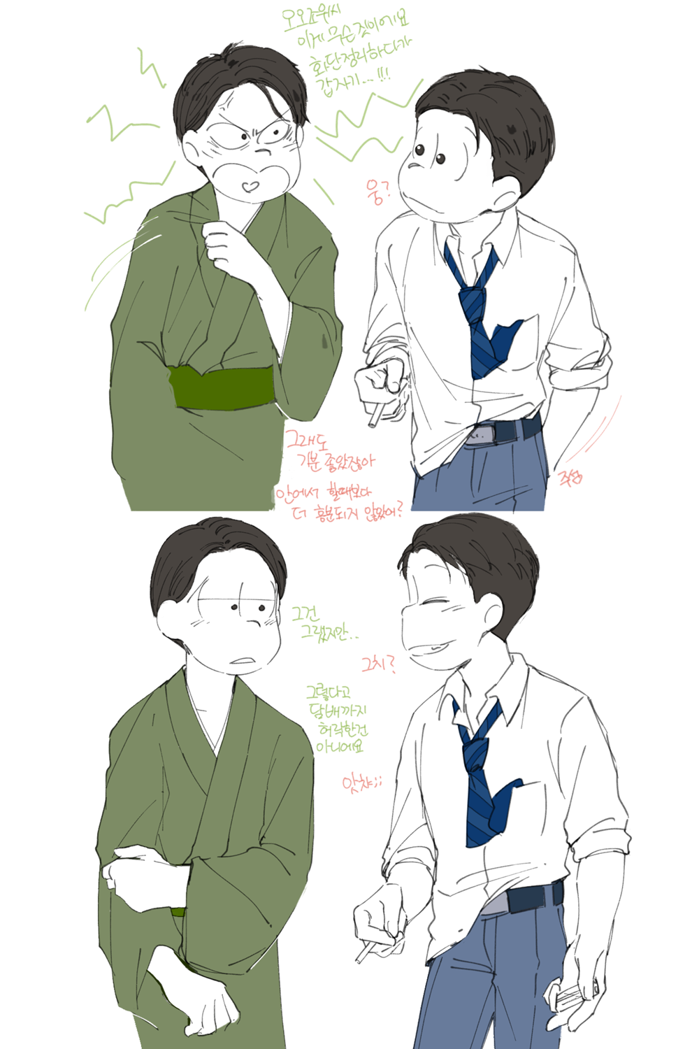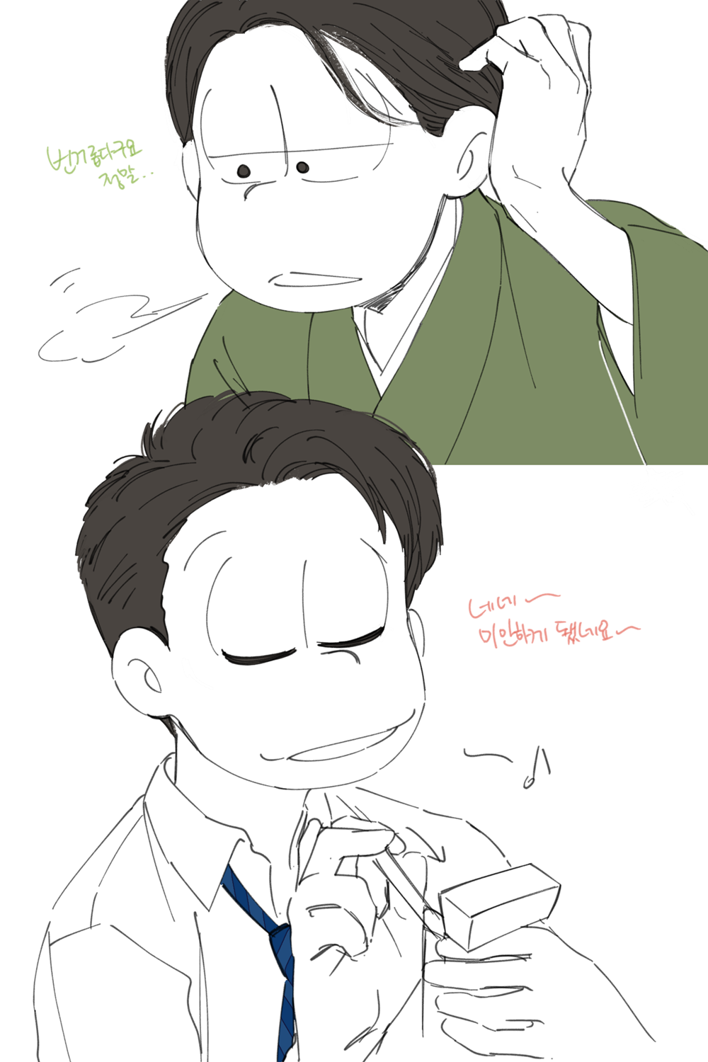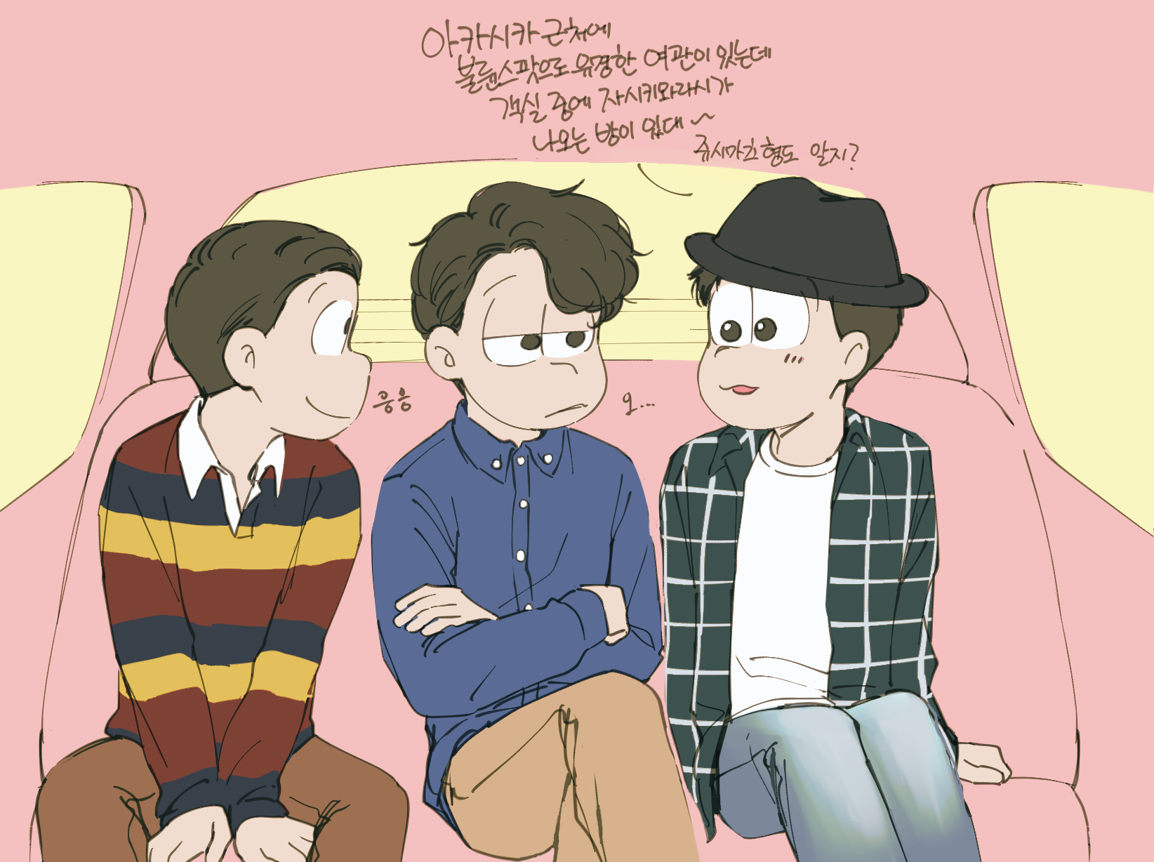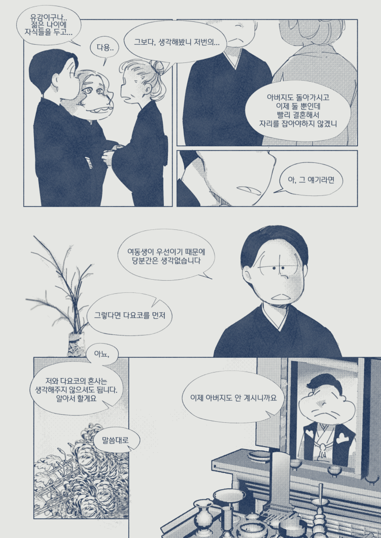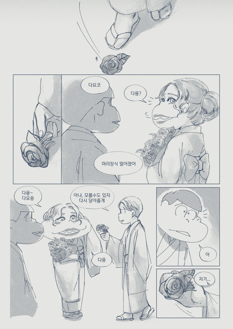 🍏180826*13:58 저 장면 그리느라 저 형제들전부가 처음으로 조우하게되는부분 엄청 많이 읽었는데... 전기마츠 처음 봤을때부터도 생각했던거지만 쵸로스케 처음에 형제들앞에서 울었던거 너무 많은거 느껴짐 존나 내멋대로 생각하는거긴한데 아버지 죽고 하루아침에 가장이 된 부담감이라던가 여동생에 대한 책임감, 그리고 그동안 애비랑 다요코 얼굴보면서 누가봐도 안닮은거 알고 자기도 알아서 안그런척 하고있긴했지만 분명 그동안 유리된 기분 느끼고있었을거라고 궁예함.. 그래서 난데없이 형제라며 나타난 같은 얼굴 여섯을 앞에두고 자기가 어디서왔는지 이제야 알거같아서 아무말하면서 왈칵하고 운거 아닐까ㅋㅋㅋㅋ 근데 형제들도 그 기분 알거같아서 만난지도 얼마 안되고 어떻게보면 첫만남이고 그런사이에 쵸로스케가 조따 뜬금없는 타이밍에 울었는데도 막 ????? 던가 쟤 왜우냐갑자기; 이런 반응이 아니고 아~ 울어버렸다; 라던가 혼자서 너무 무리해온거아냐? 했던 거 아닌가 싶다